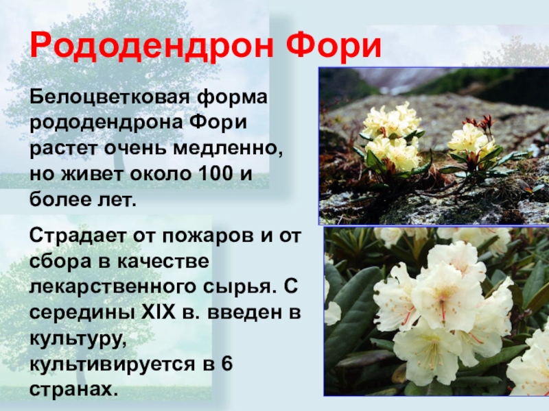 Белоцветковая форма рододендрона Фори растет очень медленно, но живет около