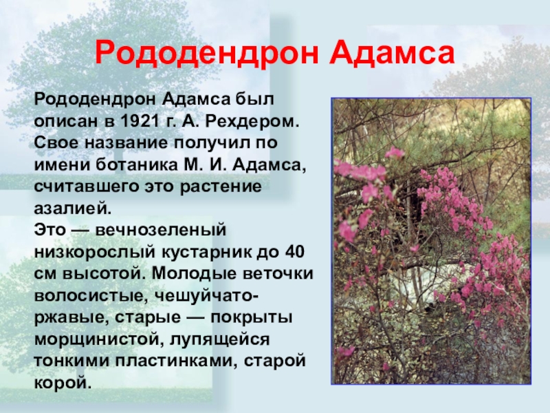 название получил по имени ботаника М. И. Адамса, считавшего это растение азалией.