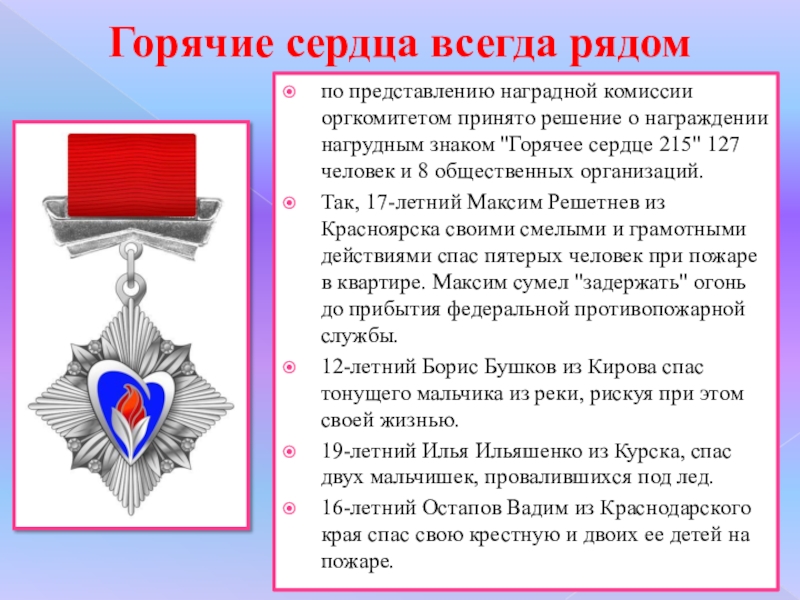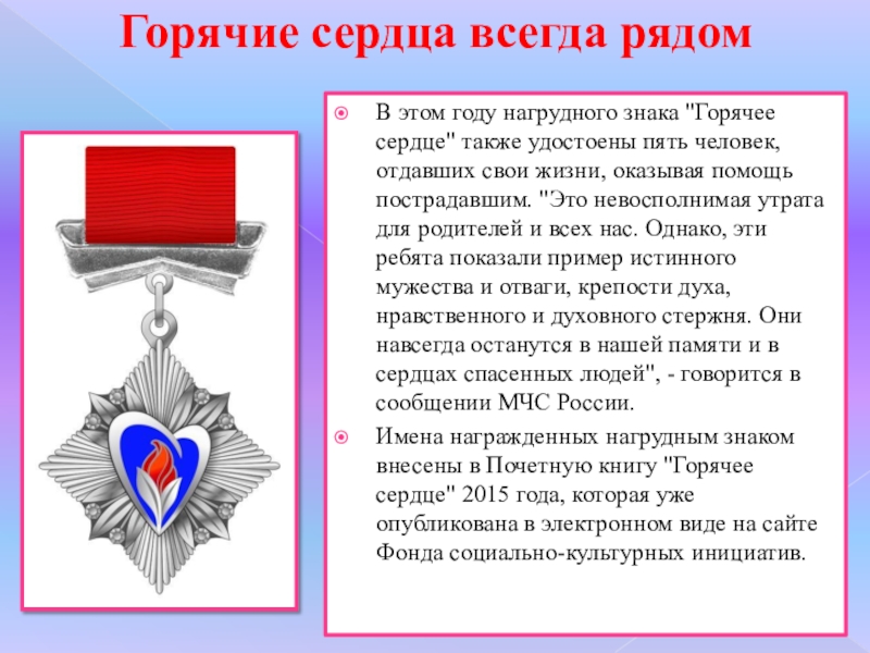 Слайд 19В этом году нагрудного знака "Горячее сердце" также удостоены пять человек,