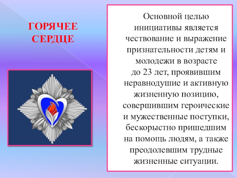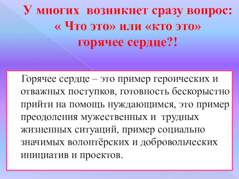Горячее сердце – это пример героических и отважных поступков, готовность бескорыстно прийти на помощь нуждающимся, это пример преодоления мужественных и трудных жизненных ситуаций, пример социально значимых волонтёрских и добровольческих инициатив и проектов.