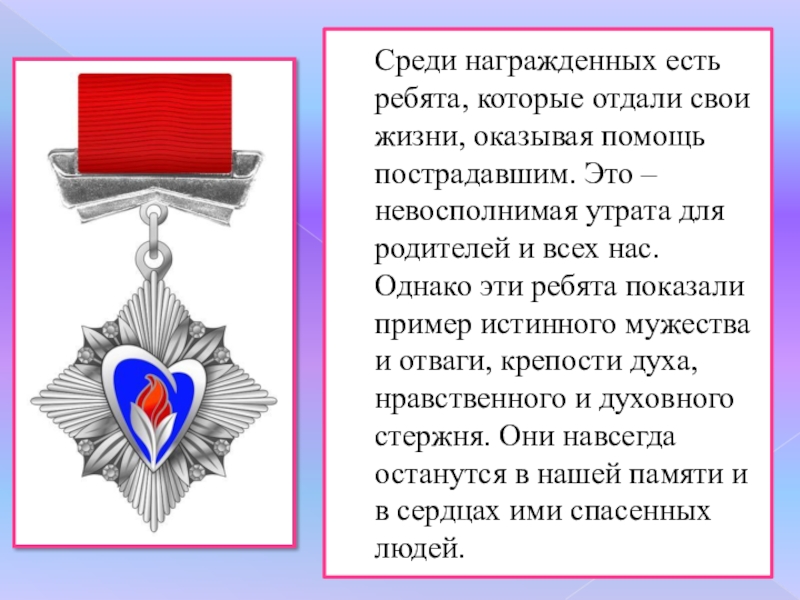 Слайд 10Среди награжденных есть ребята, которые отдали свои жизни, оказывая помощь пострадавшим.