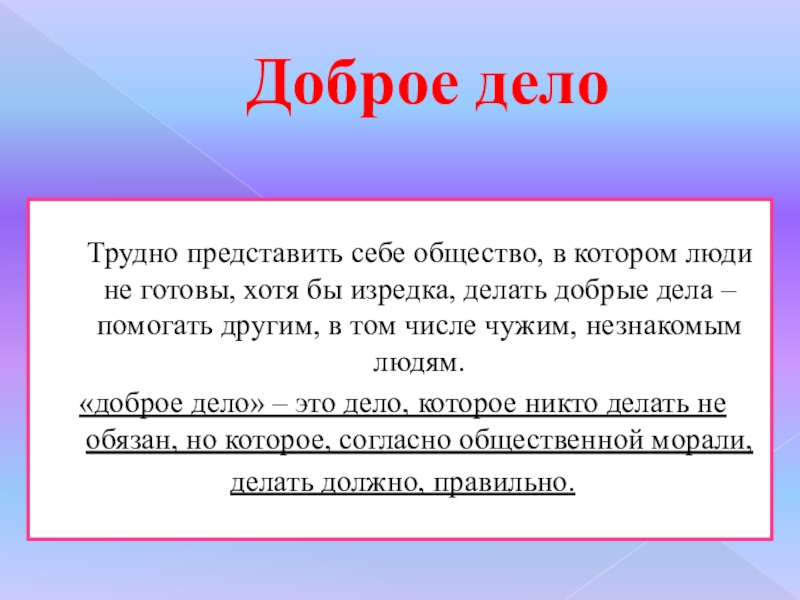«доброе дело» – это дело, которое никто делать не обязан, но которое, согласно общественной морали,