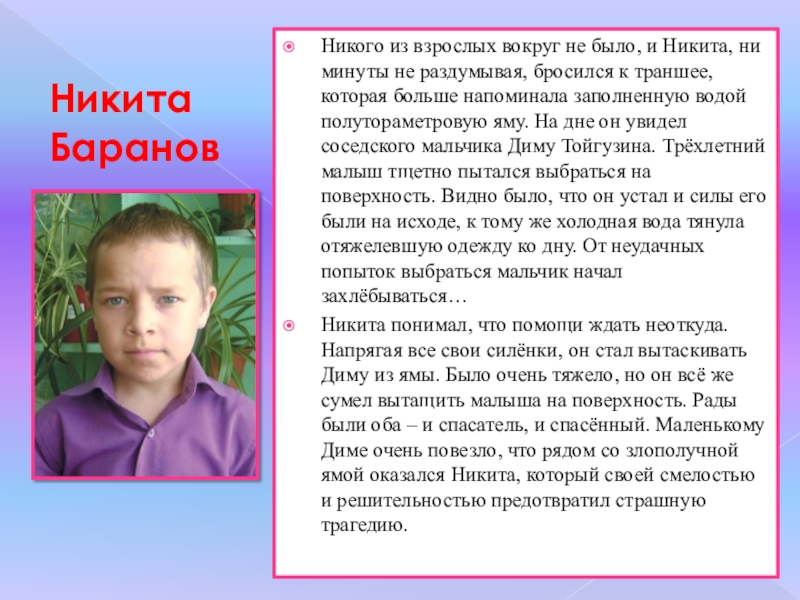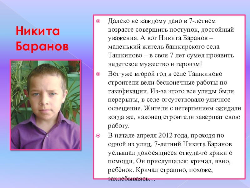 достойный уважения. А вот Никита Баранов – маленький житель башкирского села Ташкиново – в свои 7 лет сумел проявить недетское мужество и героизм!
