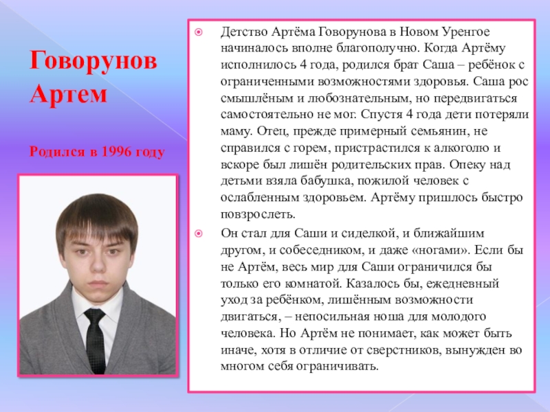 начиналось вполне благополучно. Когда Артёму исполнилось 4 года, родился брат Саша – ребёнок с ограниченными возможностями здоровья. Саша рос смышлёным и любознательным, но передвигаться самостоятельно не мог. Спустя 4 года дети потеряли маму. Отец, прежде примерный семьянин, не справился с горем, пристрастился к алкоголю и вскоре был лишён родительских прав. Опеку над детьми взяла бабушка, пожилой человек с ослабленным здоровьем. Артёму пришлось быстро повзрослеть.