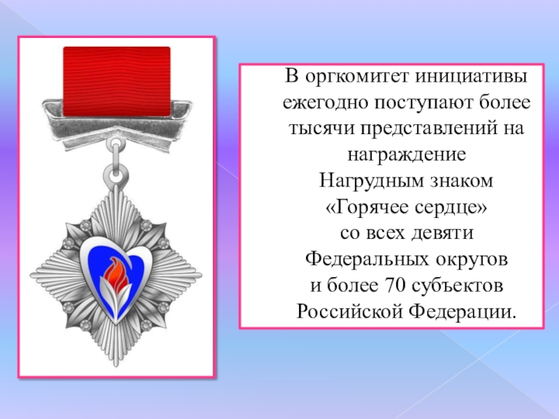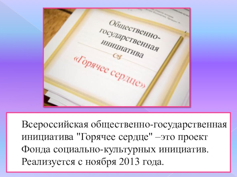Слайд 5Всероссийская общественно-государственная инициатива "Горячее сердце" –это проект Фонда социально-культурных инициатив. Реализуется