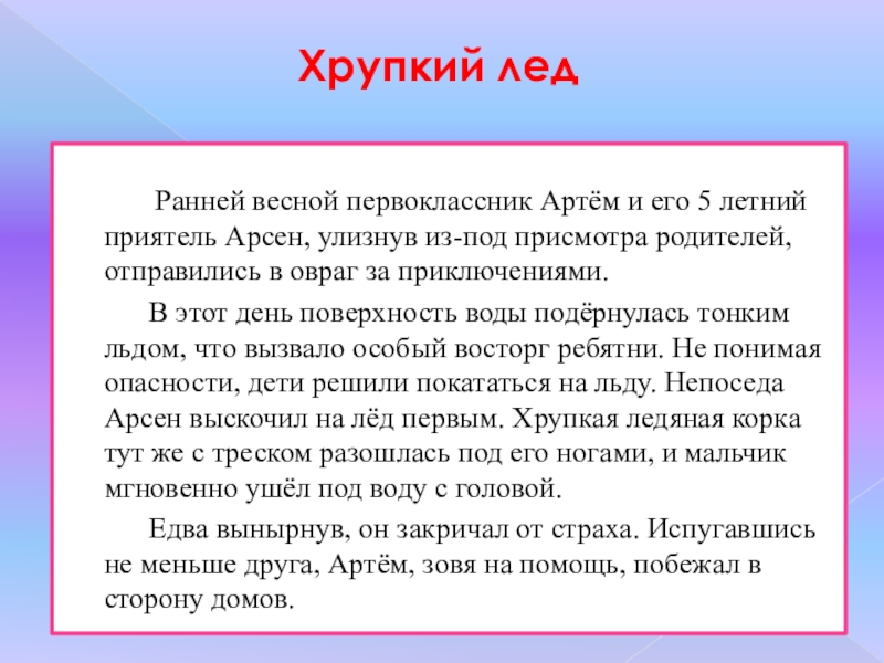 В этот день поверхность воды подёрнулась тонким льдом, что вызвало особый восторг ребятни. Не понимая опасности, дети решили покататься на льду. Непоседа Арсен выскочил на лёд первым. Хрупкая ледяная корка тут же с треском разошлась под его ногами, и мальчик мгновенно ушёл под воду с головой.