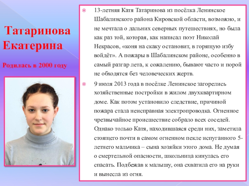Шабалинского района Кировской области, возможно, и не мечтала о дальних северных путешествиях, но была как раз той, которая, как написал поэт Николай Некрасов, «коня на скаку остановит, в горящую избу войдёт». А пожары в Шабалинском районе, особенно в самый разгар лета, к сожалению, бывают часто и порой не обходятся без человеческих жертв.
