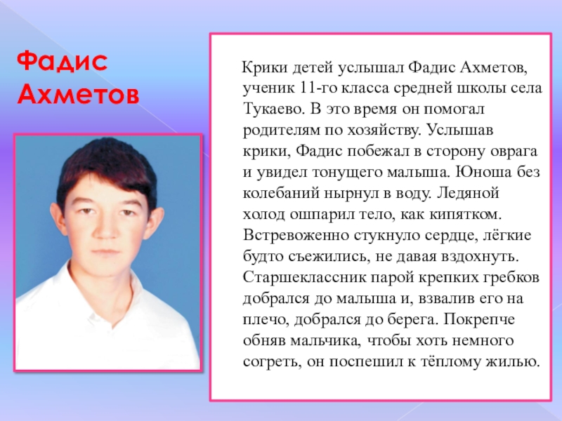 ученик 11-го класса средней школы села Тукаево. В это время он помогал родителям по хозяйству. Услышав крики, Фадис побежал в сторону оврага и увидел тонущего малыша. Юноша без колебаний нырнул в воду. Ледяной холод ошпарил тело, как кипятком. Встревоженно стукнуло сердце, лёгкие будто съежились, не давая вздохнуть. Старшеклассник парой крепких гребков добрался до малыша и, взвалив его на плечо, добрался до берега. Покрепче обняв мальчика, чтобы хоть немного согреть, он поспешил к тёплому жилью.