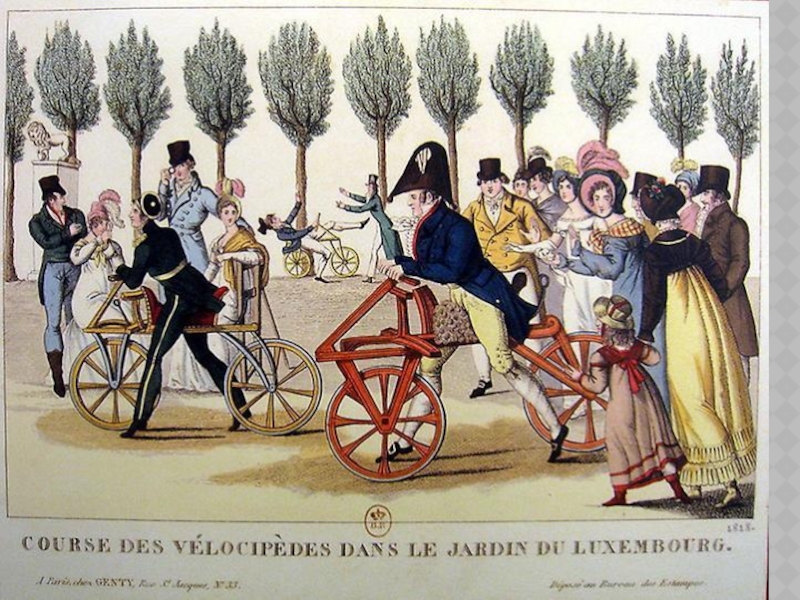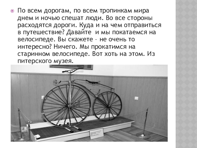 люди. Во все стороны расходятся дороги. Куда и на чем отправиться в путешествие? Давайте и мы покатаемся на велосипеде. Вы скажете – не очень то интересно? Ничего. Мы прокатимся на старинном велосипеде. Вот хоть на этом. Из питерского музея.