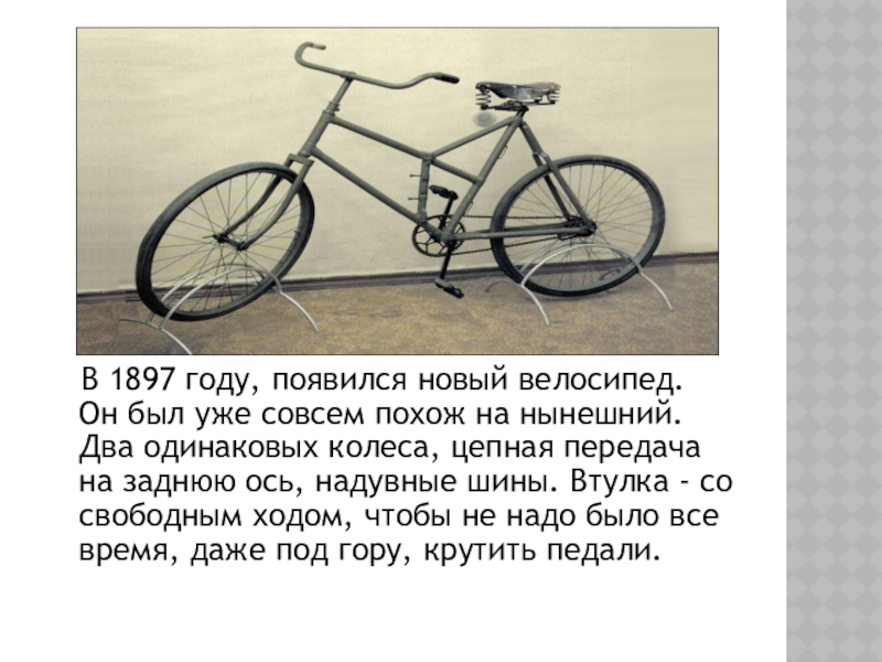 Слайд 7 В 1897 году, появился новый велосипед. Он был уже