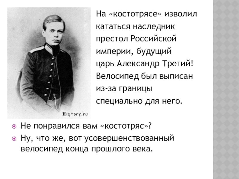 -создать презентацию для того, чтобы познакомить ребят с историей велосипеда и заинтересовать их.
