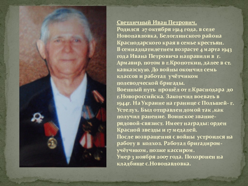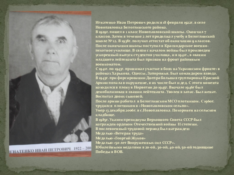 Слайд 9Игнатенко Иван Петрович родился 18 февраля 1922г. в селе Новопавловка Белоглинского