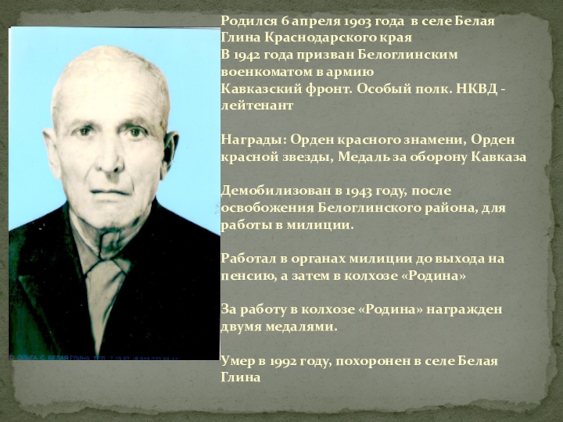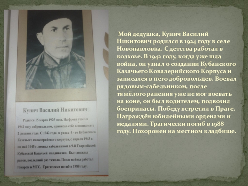 Слайд 12 Мой дедушка, Кунич Василий Никитович родился в 1924 году в