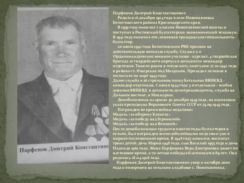 Парфенов Дмитрий Константинович умер 11 октября 2000 года и похоронен на сельском кладбище с. Новопавловка.