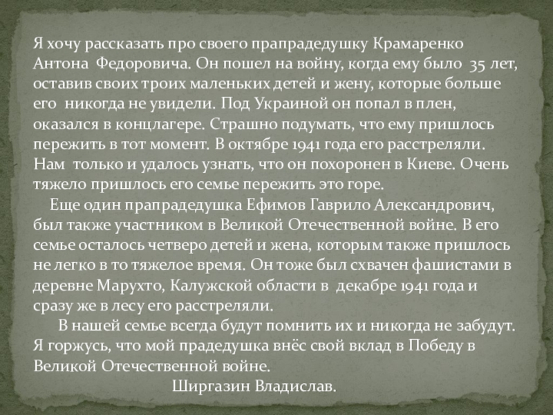 Еще один прапрадедушка Ефимов Гаврило Александрович, был также участником в Великой Отечественной войне. В его семье осталось четверо детей и жена, которым также пришлось не легко в то тяжелое время. Он тоже был схвачен фашистами в деревне Марухто, Калужской области в декабре 1941 года и сразу же в лесу его расстреляли.