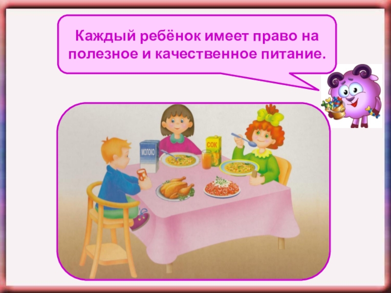 Слайд 7Каждый ребёнок имеет право на полезное и качественное питание.