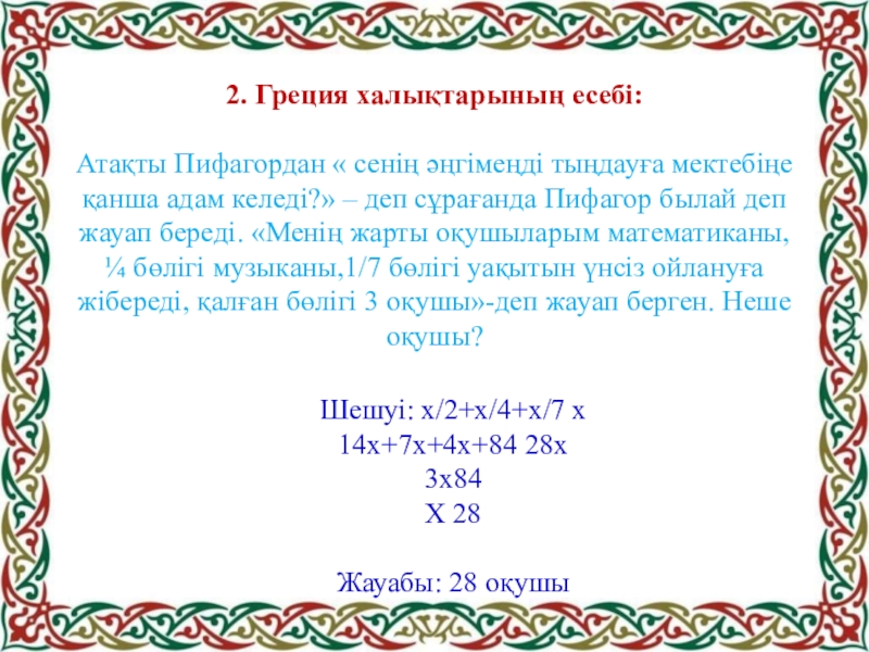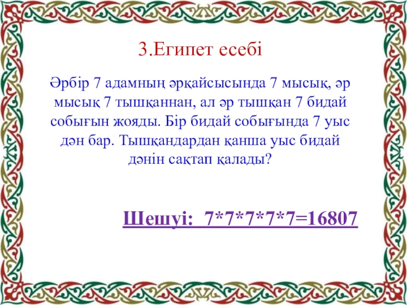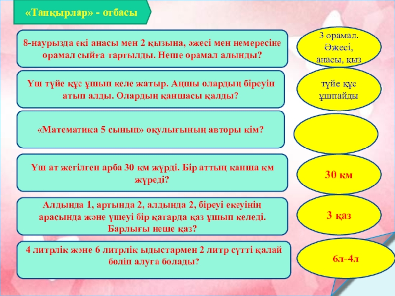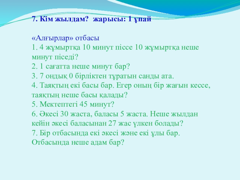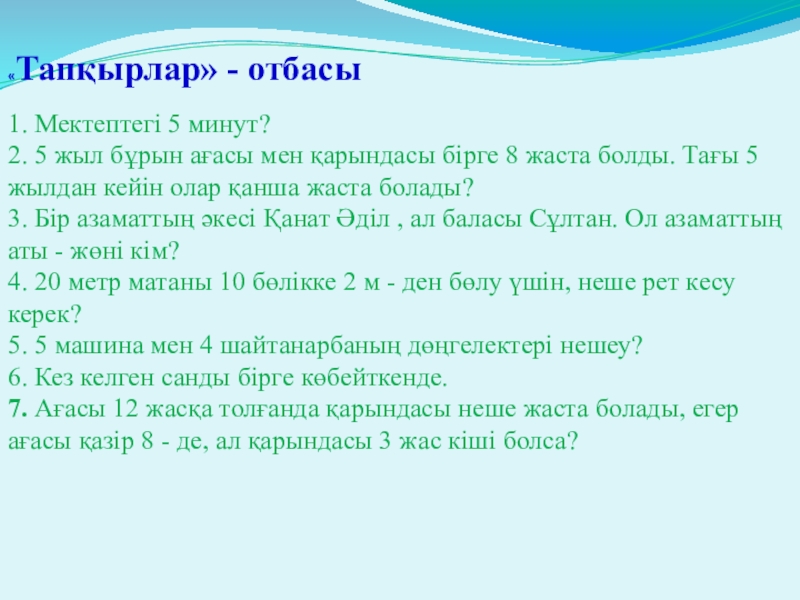 Алдында 1, артында 2, алдында 2, біреуі екеуінің арасында және үшеуі бір қатарда қаз ұшып келеді. Барлығы неше қаз?