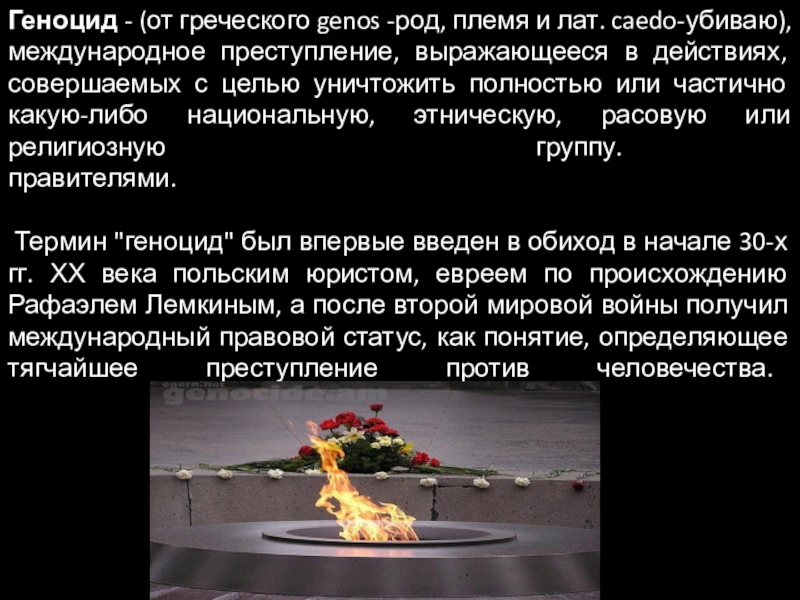 Слайд 3Геноцид - (от греческого genos -род, племя и лат. caedo-убиваю), международное преступление,