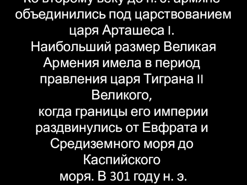 Слайд 6Ко второму веку до н. э. армяне объединились под царствованием царя