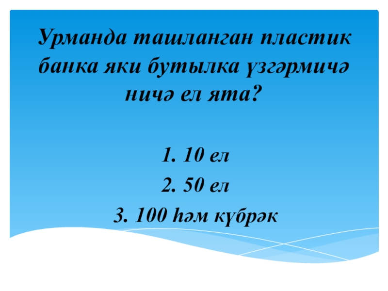 Слайд 15Урманда ташланган пластик банка яки бутылка үзгәрмичә ничә ел ята?
