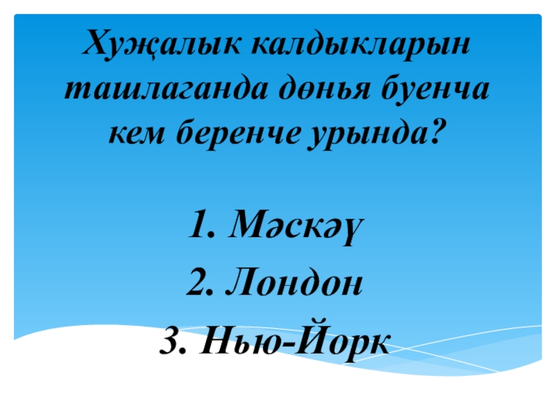 Хуҗалык калдыкларын ташлаганда дөнья буенча кем беренче урында?1. Мәскәү2. Лондон3. Нью-Йорк
