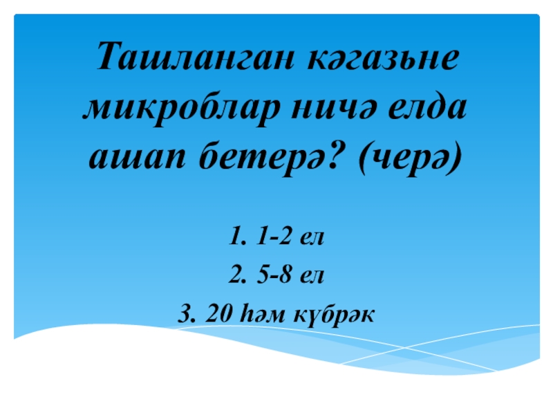 Ташланган кәгазьне микроблар ничә елда ашап бетерә? (черә)1. 1-2 ел2. 5-8 ел3. 20 һәм күбрәк