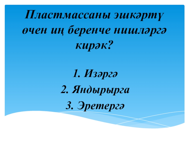 Пластмассаны эшкәртү өчен иң беренче нишләргә кирәк?1. Изәргә 2. Яндырырга3. Эретергә