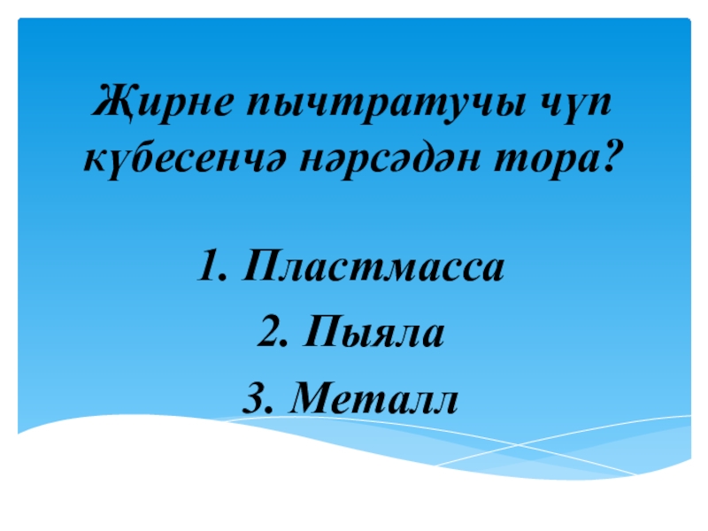 Җирне пычтратучы чүп күбесенчә нәрсәдән тора?1. Пластмасса2. Пыяла3. Металл