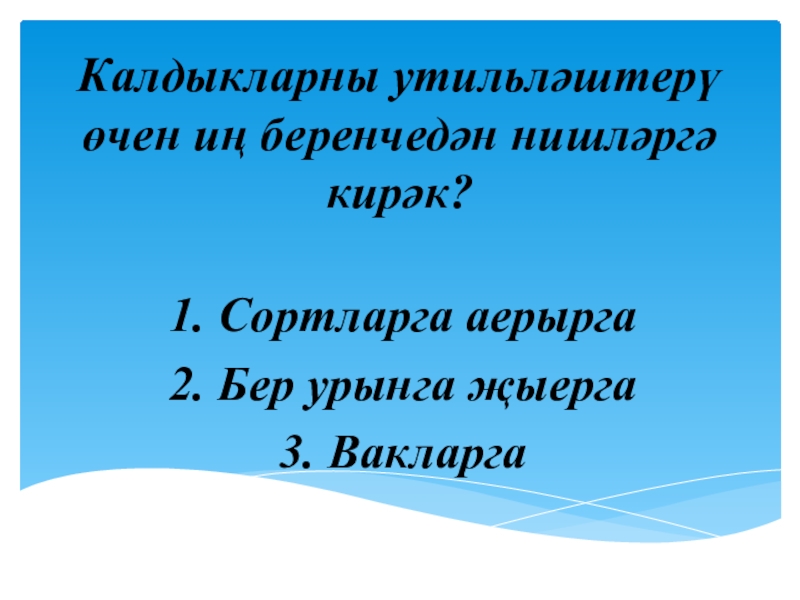 Слайд 7Калдыкларны утильләштерү өчен иң беренчедән нишләргә кирәк?