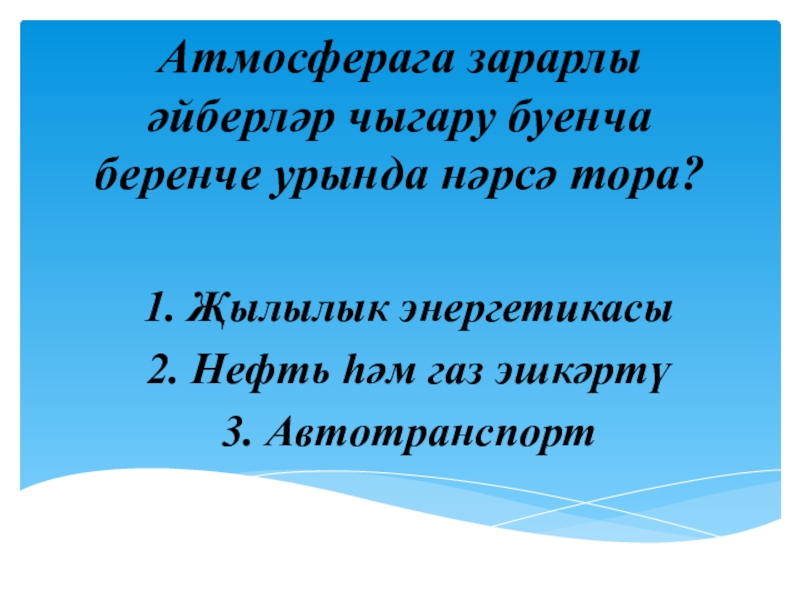 Атмосферага зарарлы әйберләр чыгару буенча беренче урында нәрсә тора?1. Җылылык энергетикасы 2. Нефть һәм газ эшкәртү3. Автотранспорт