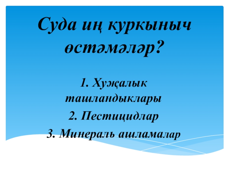 Суда иң куркыныч өстәмәләр?1. Хуҗалык ташландыклары 2. Пестицидлар3. Минераль ашламалар
