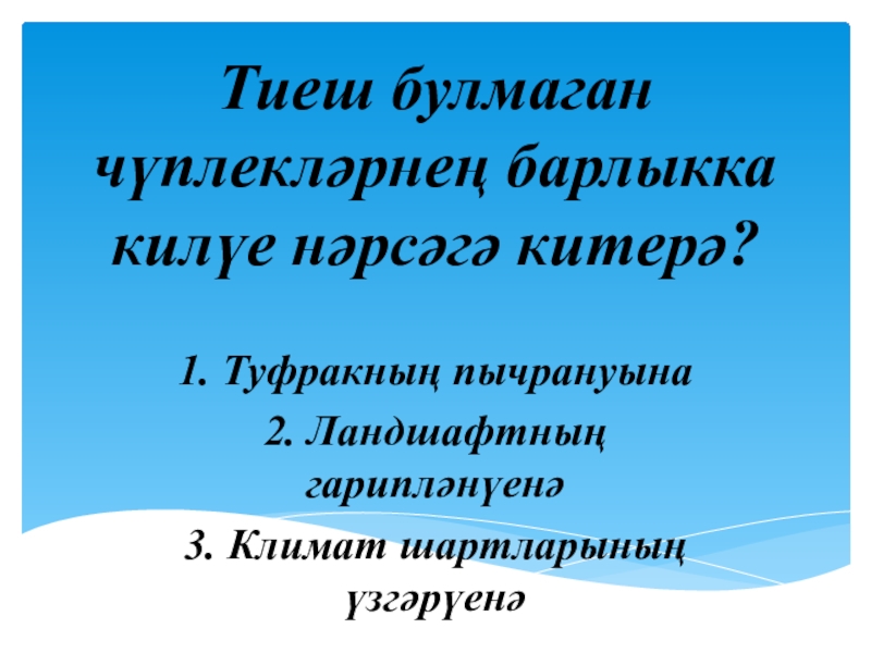 Тиеш булмаган чүплекләрнең барлыкка килүе нәрсәгә китерә?1. Туфракның пычрануына 2. Ландшафтның гарипләнүенә3. Климат шартларының үзгәрүенә