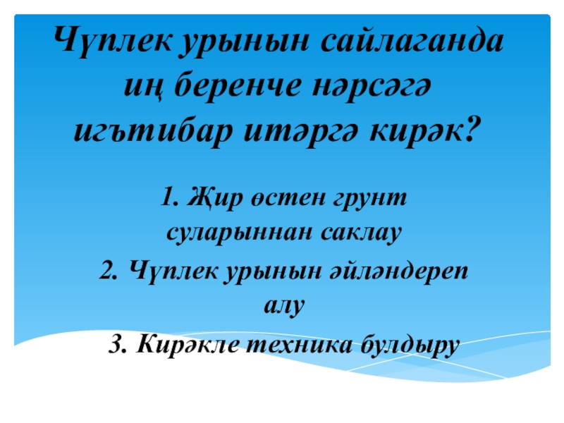 Слайд 9Чүплек урынын сайлаганда иң беренче нәрсәгә игътибар итәргә кирәк?