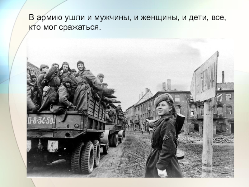 Слайд 4В армию ушли и мужчины, и женщины, и дети, все,