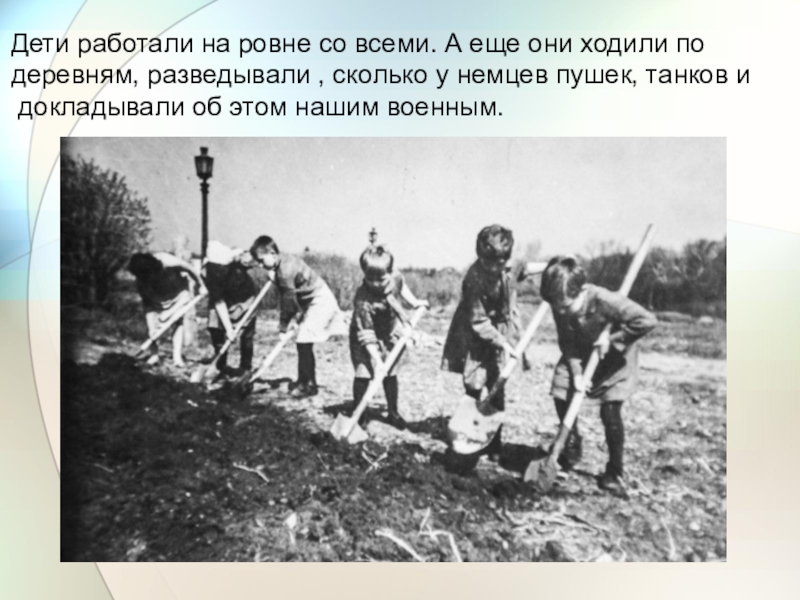 Дети работали на ровне со всеми. А еще они ходили по деревням, разведывали , сколько у немцев