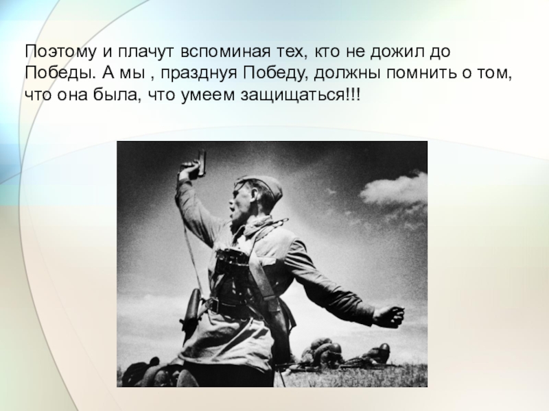 Слайд 10Поэтому и плачут вспоминая тех, кто не дожил до Победы. А