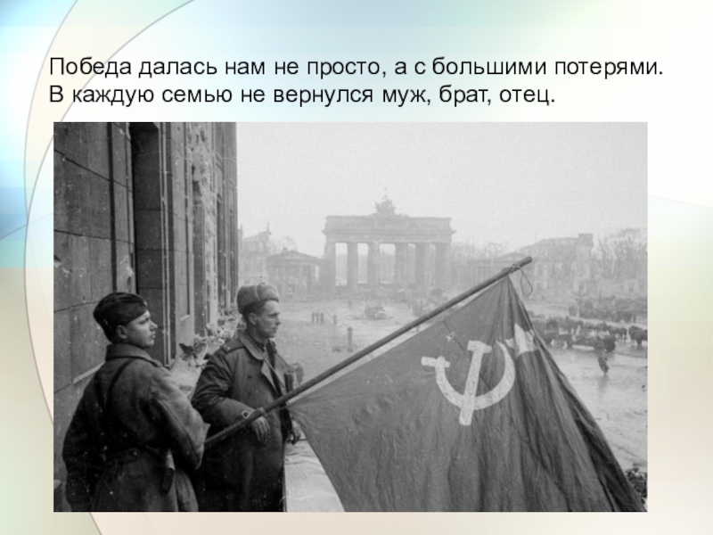 Слайд 9Победа далась нам не просто, а с большими потерями.