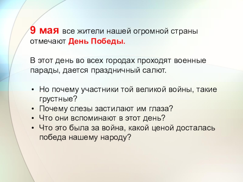 9 мая все жители нашей огромной страны отмечают День Победы.В этот день во всех городах проходят военные парады, дается праздничный салют. Но почему участники той великой войны, такие грустные?Почему слезы застилают им глаза? Что они вспоминают