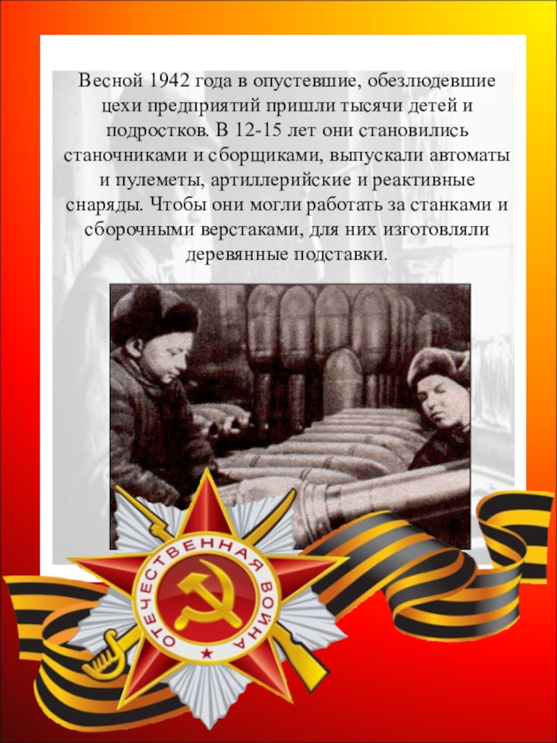 Слайд 28Весной 1942 года в опустевшие, обезлюдевшие цехи предприятий пришли тысячи детей