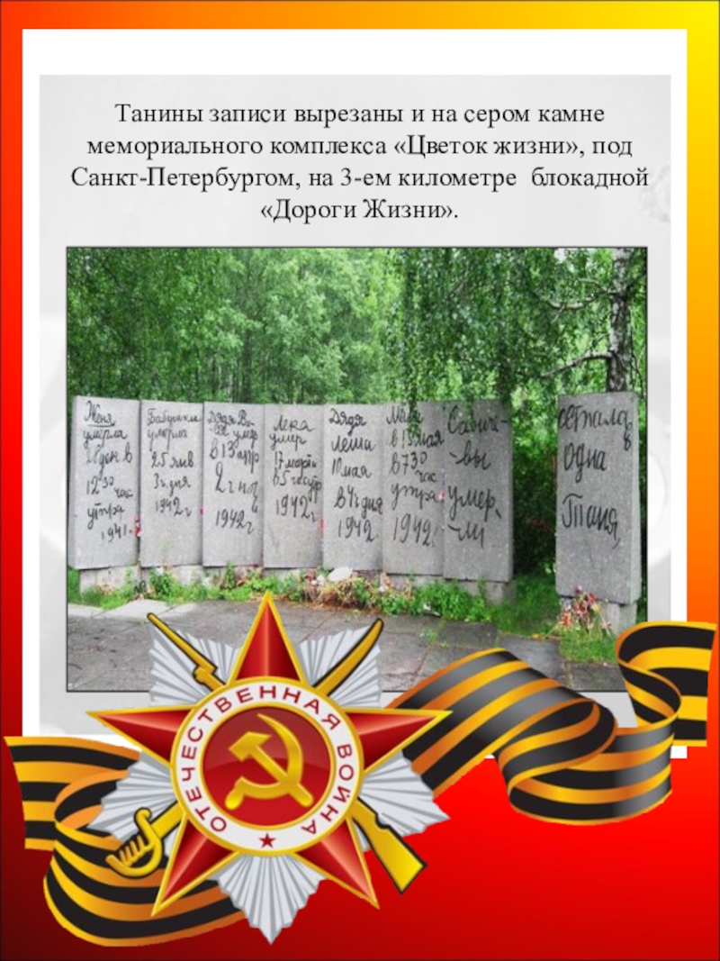 Слайд 45Танины записи вырезаны и на сером камне мемориального комплекса «Цветок жизни»,