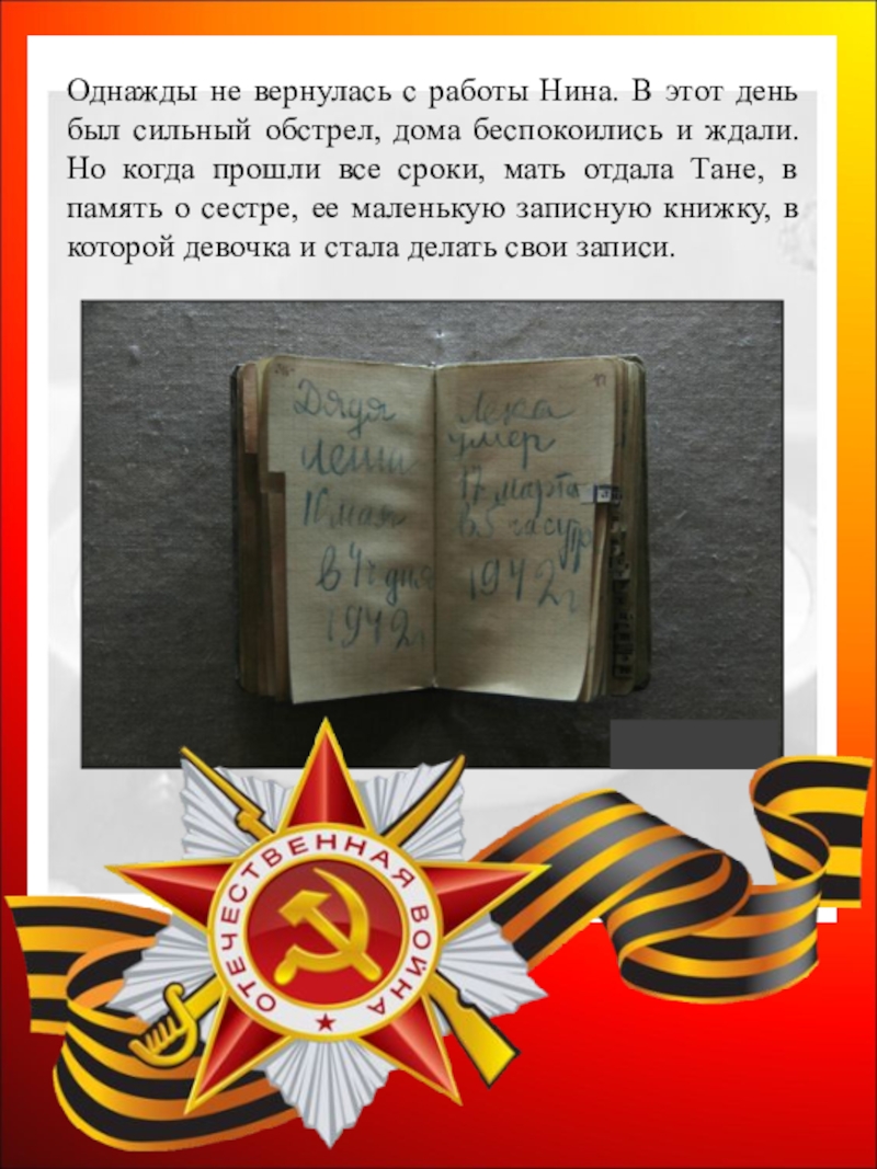 обстрел, дома беспокоились и ждали. Но когда прошли все сроки, мать отдала Тане, в память о сестре, ее маленькую записную книжку, в которой девочка и стала делать свои записи.