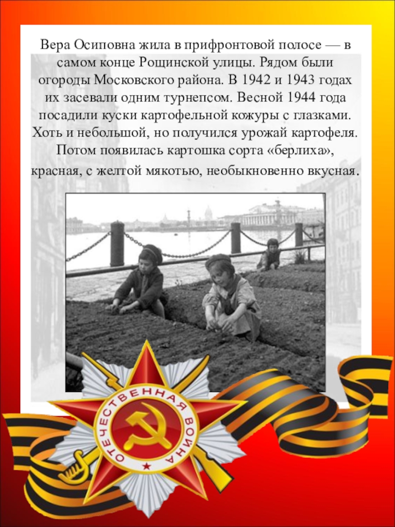 Слайд 23Вера Осиповна жила в прифронтовой полосе — в самом конце Рощинской