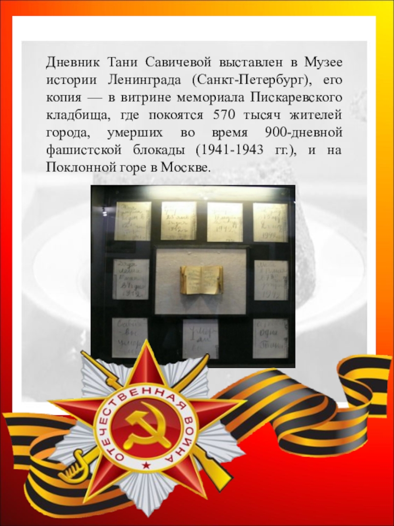 Слайд 44Дневник Тани Савичевой выставлен в Музее истории Ленинграда (Санкт-Петербург), его копия