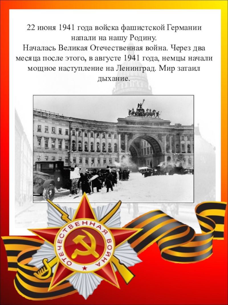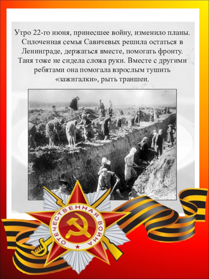 Слайд 36Утро 22-го июня, принесшее войну, изменило планы. Сплоченная семья Савичевых решила