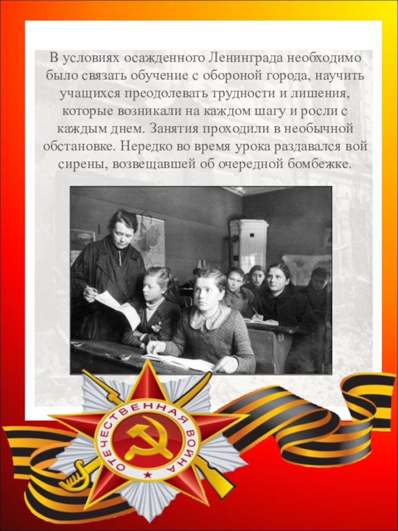 Слайд 11В условиях осажденного Ленинграда необходимо было связать обучение с обороной города,