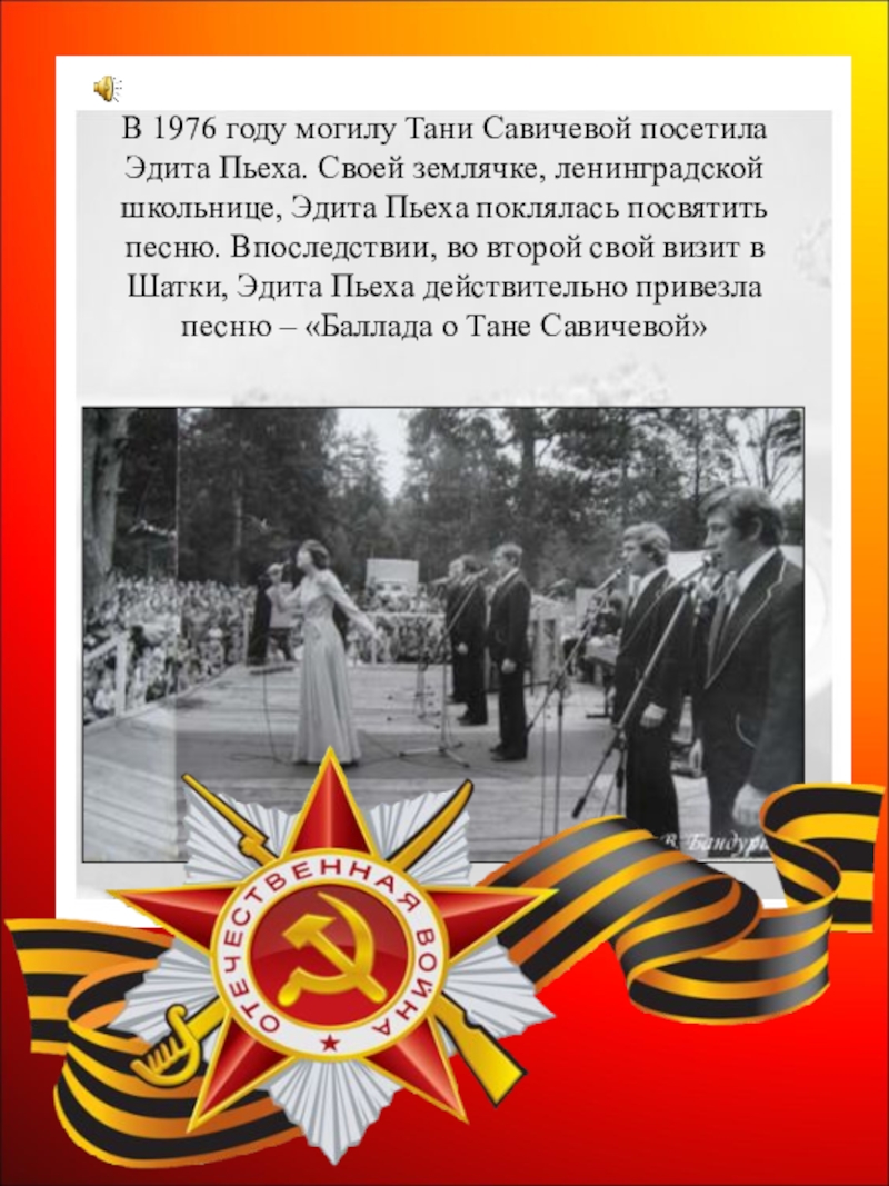 Слайд 42В 1976 году могилу Тани Савичевой посетила Эдита Пьеха. Своей землячке,