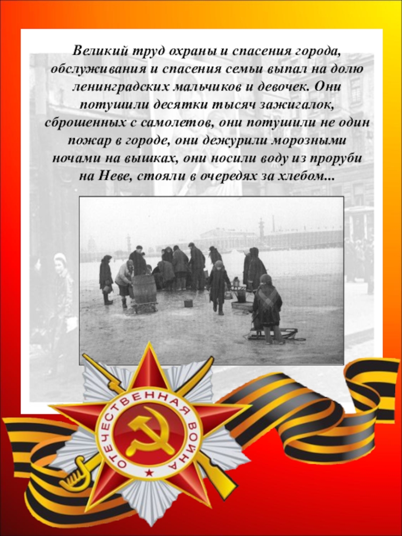 на долю ленинградских мальчиков и девочек. Они потушили десятки тысяч зажигалок, сброшенных с самолетов, они потушили не один пожар в городе, они дежурили морозными ночами на вышках, они носили воду из проруби на Неве, стояли в очередях за хлебом...