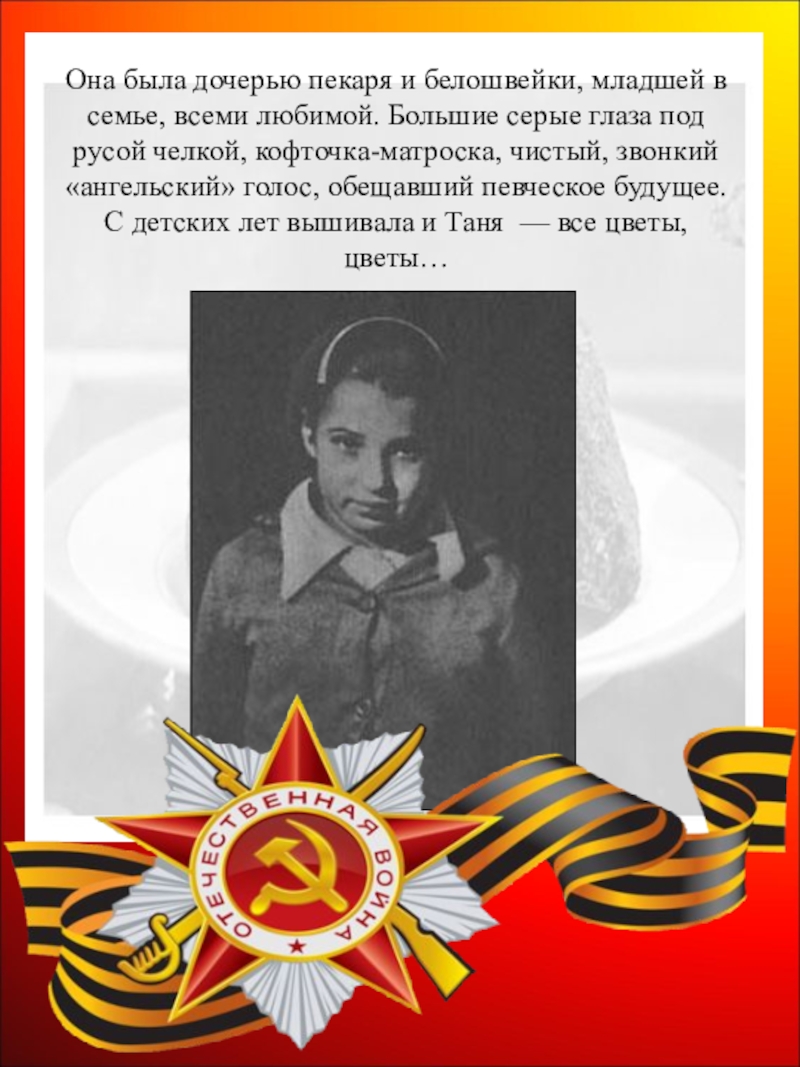 Большие серые глаза под русой челкой, кофточка-матроска, чистый, звонкий «ангельский» голос, обещавший певческое будущее. С детских лет вышивала и Таня — все цветы, цветы…