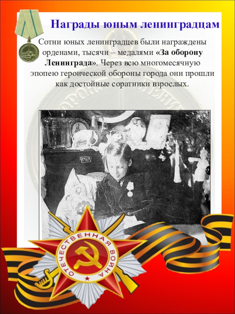 Слайд 46Сотни юных ленинградцев были награждены орденами, тысячи – медалями «За оборону Ленинграда».
