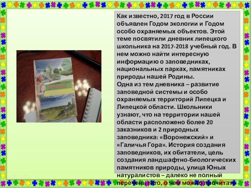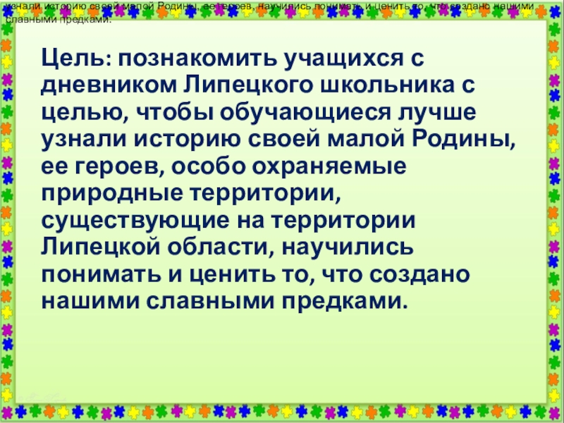 Цель: познакомить учащихся с дневником Липецкого школьника с целью, чтобы обучающиеся лучше узнали историю своей малой Родины, ее героев, особо охраняемые природные территории, существующие на территории Липецкой области, научились понимать и ценить то, что создано нашими славными предками.